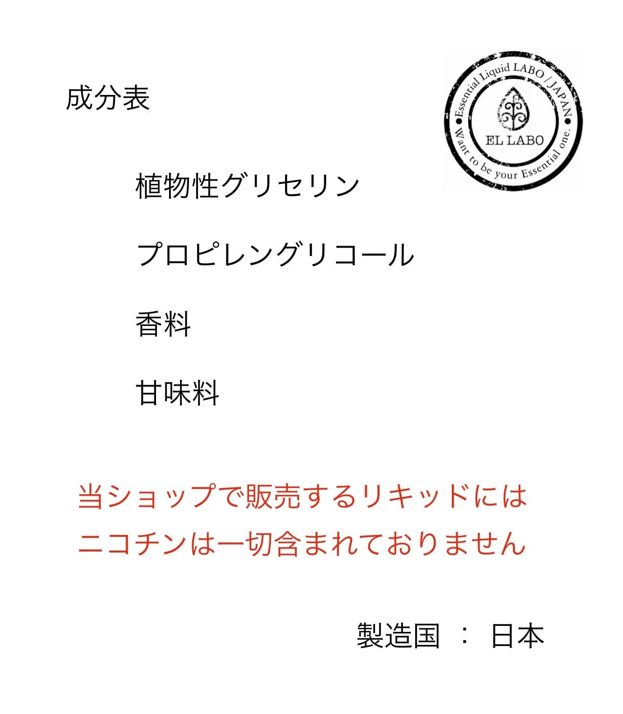 ベース液及び香料は全て厳選した食品グレードのものを使用しております。
